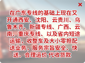 | 泰安市潤(rùn)邦運(yùn)輸有限公司專(zhuān)門(mén)提供泰安廣州專(zhuān)線(xiàn)、泰安到廣州專(zhuān)線(xiàn)、廣州回程車(chē)運(yùn)輸?shù)鹊?,在廣東專(zhuān)線(xiàn)的基礎(chǔ)上現(xiàn)在又開(kāi)通西安、沈陽(yáng)、云貴川、烏魯木齊、新疆專(zhuān)線(xiàn)、廣西、云南、重慶專(zhuān)線(xiàn)、以及省內(nèi)短途運(yùn)輸,收整車(chē)及大小零擔(dān)配送業(yè)務(wù),服務(wù)宗旨安全、快送、合理運(yùn)價(jià),代收貨款。公司位于泰山腳下,是經(jīng)山東省交通廳、市交通局批準(zhǔn)設(shè)立的單位,組織健全、經(jīng)驗(yàn)豐富、設(shè)施完善,備有大型停車(chē)場(chǎng)、倉(cāng)儲(chǔ)賓館。公司擁有自己的運(yùn)輸隊(duì)伍,手續(xù)齊全,保險(xiǎn)可靠。龐大的運(yùn)輸網(wǎng)絡(luò)使您的貨物更加、快捷地運(yùn)往各地。 |
